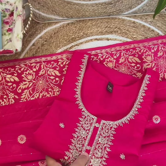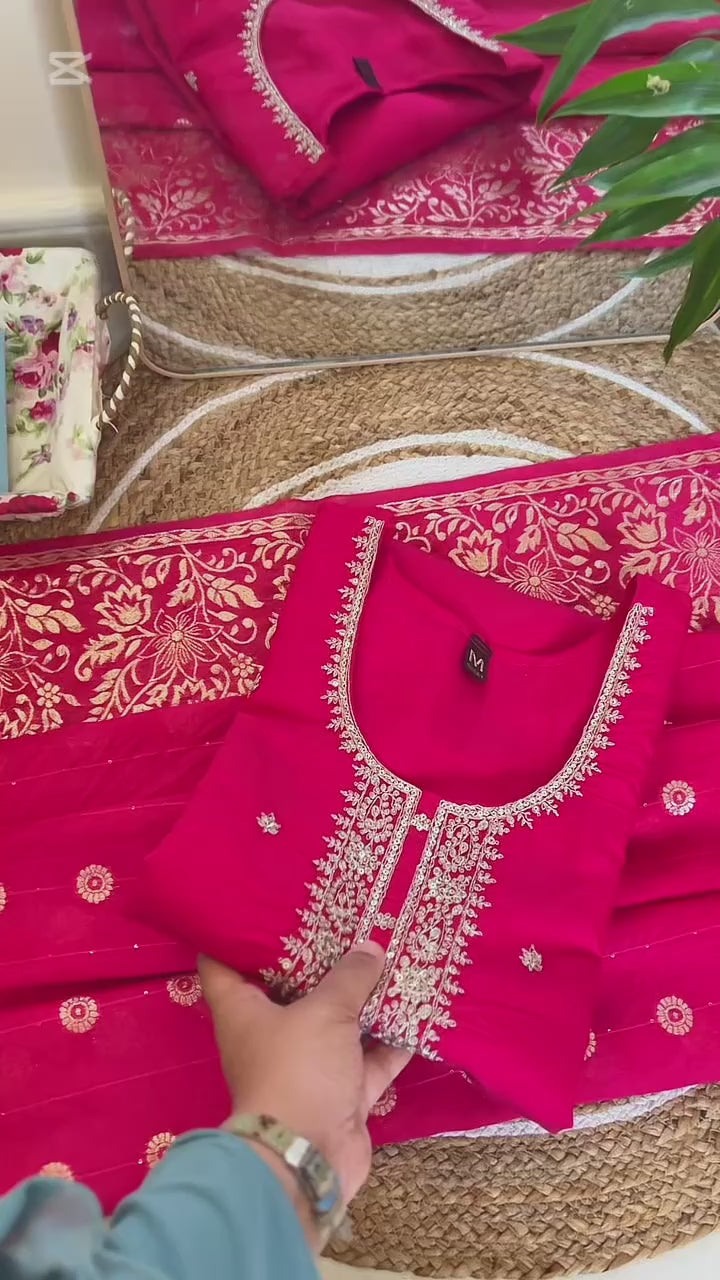 Expertly crafted with cotton silk material Kurtie and pant, this elegant suit includes a stunning banarasi type dupatta and intricate sequence work on the kurtie. Experience luxurious comfort and effortless style with this timeless piece.